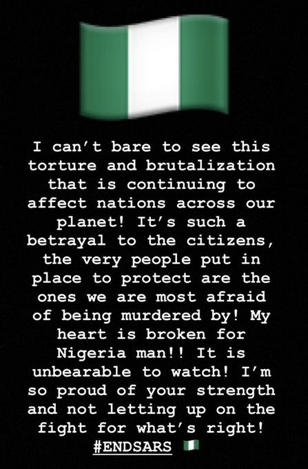 “I am heartbroken to see the senseless brutality taking place in Nigeria,” wrote Beyoncé on Instagram. “There has to be an end to SARS. We have been working on partnerships with youth organizations to support those protesting for change. We are collaborating with coalitions to provide emergency healthcare, food, and shelter. To our Nigerian sisters and brothers, we stand with you. Please visit beyonce.com for a list of organizations to show your support.